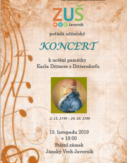 ZUŠ Javorník vás srdečně zve na koncert k uctění památky vídeňského rodáka, houslového virtuóza a zakladatele komické opery Karla Ditterse z Dittersdorfu, který dlouhá léta pobýval v Javorníku. Letos je to přesně 280 let od narození a 220 let od úmrtí tohoto slavného skladatele. Koncert v podání našich učitelů se bude konat 15. listopadu v 18:00 v koncertním sále Státního zámku Jánský Vrch v Javorníku. Těšíme se na vás!
