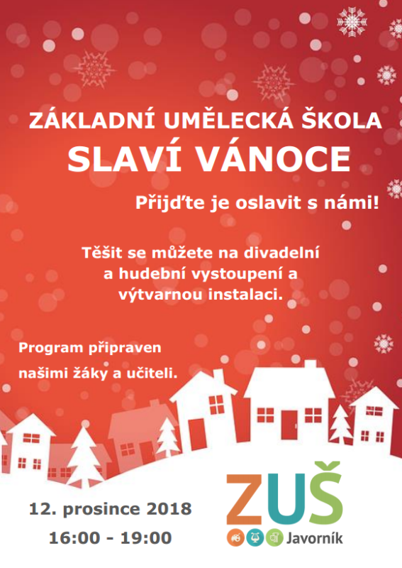 Ve středu 12. prosince 2018 se naše škola promění ve velkou vánoční oslavu. Všechny tři obory (hudební, výtvarný a literárně-dramatický) Vám nadělí bohatý program. Můžete se těšit na minikoncerty, vánoční příběhy a výzdobu. Prohlídky budou probíhat každých dvacet minut mezi 16:00 a 19:00, pro čekající je přichystán program v koncertním sále. V dopoledních hodinách nás navštíví děti z Mateřské školy Polská a Míru.